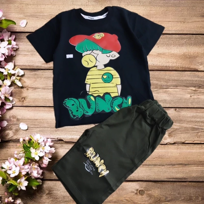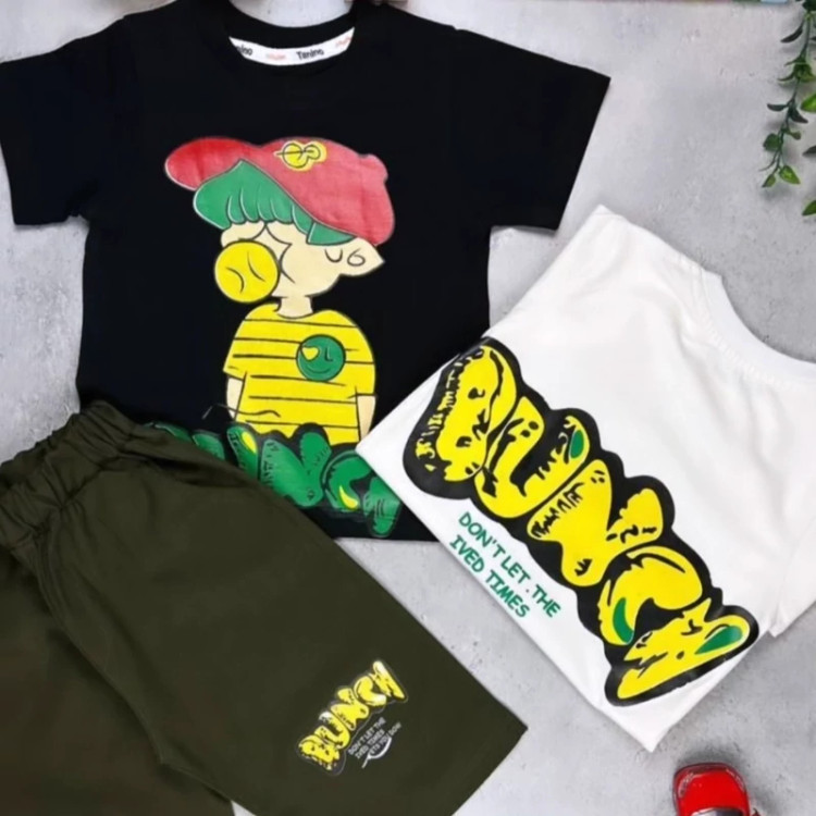 ست تیشرت و شلوارک پسرانه bunch👌 🌈سفر به دنیای رنگارنگ کودکان با نی نی کیوت🌈 پشت تیشرت هم چاپ خورده بسیار تنخور زیبایی داره..